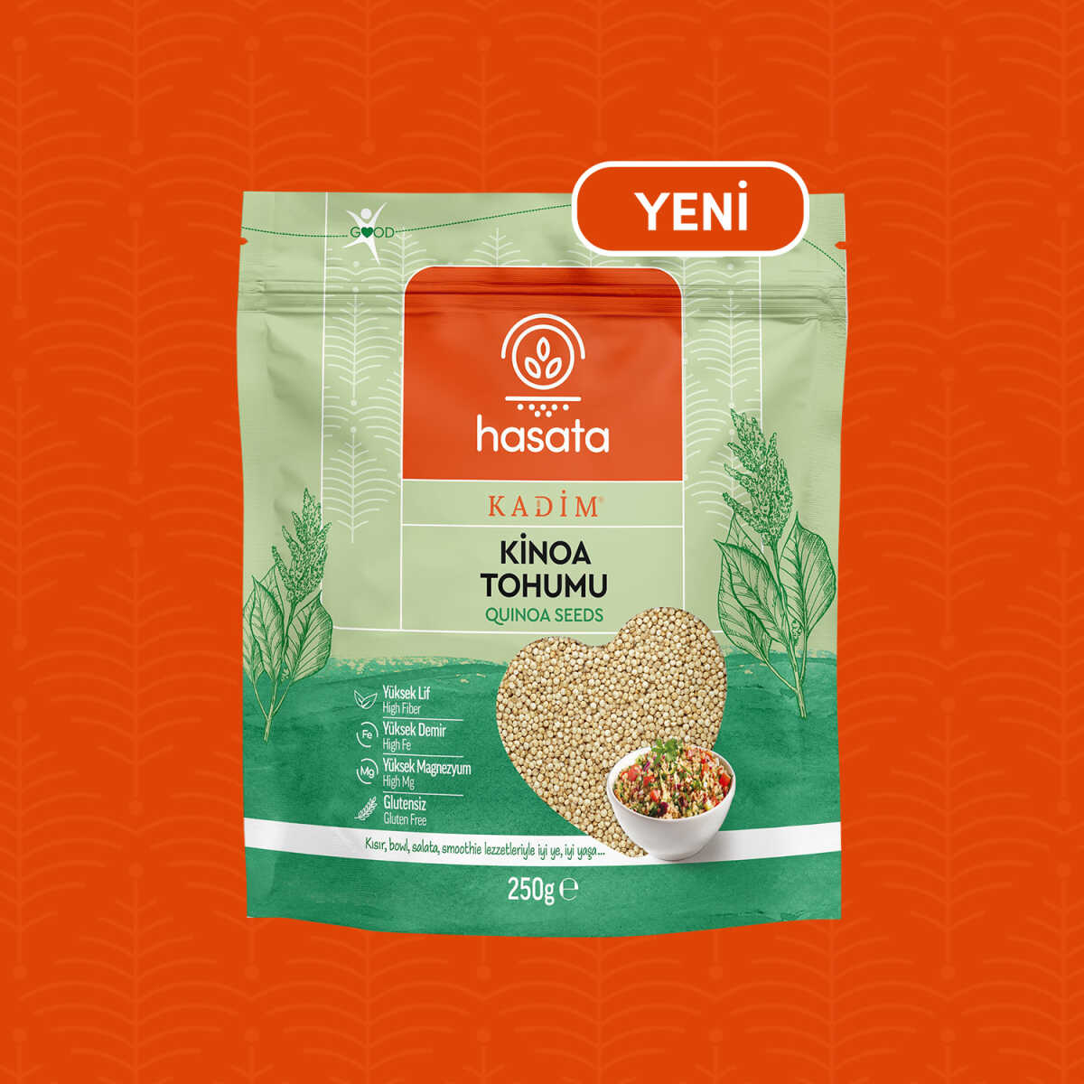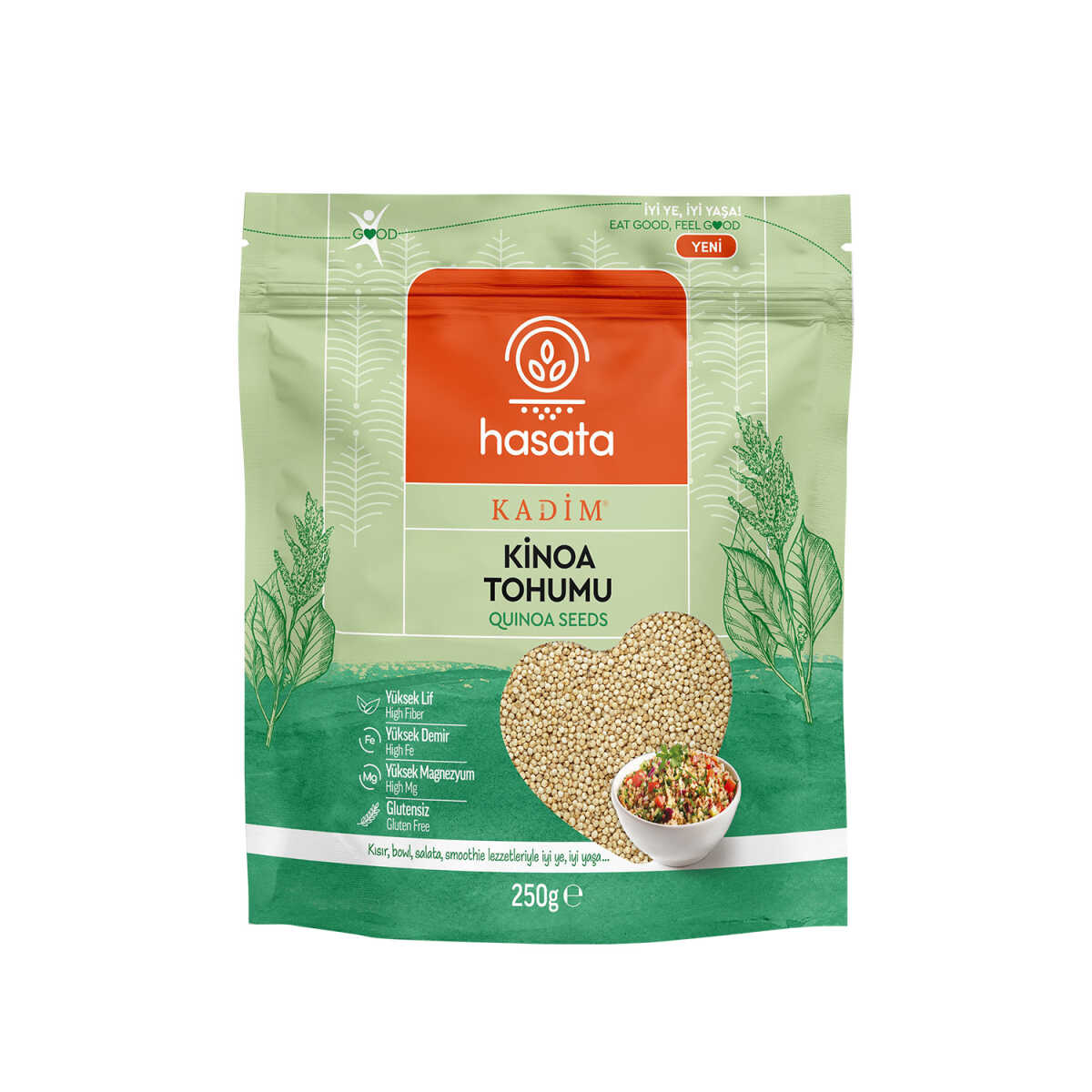 Hasata Kinoa Tohumu, tohumdan sofraya bütün iyiliğini ve lezzetini içinde korur. Yüksek lif, Mg veFe içeriği sayesinde doyurucu ve besleyici öğünler sağlarken, gluten de içerir.